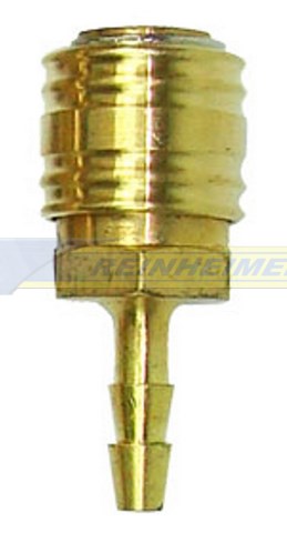 Einhandschnellkupplung mit Walzenverriegelung. Rueckschlagventil in der Kupplung, beim Kuppeln zwangsweise entriegelt. Stecker ohne Rueckschlagventil. Tuelle zum Aufschieben des Schlauches und Sichern mit Schlauchklemme.